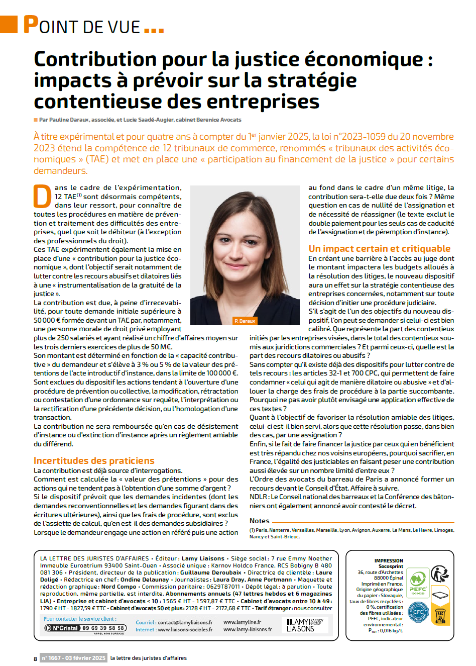 Pauline Daraux, Avocate associée et Lucie Saadé-Augier, Avocate, reviennent dans la Lettre des Juristes d’Affaires sur le contexte et les objectifs de cette réforme, ainsi que sur les – nombreuses – incertitudes pour les praticiens du contentieux des affaires.